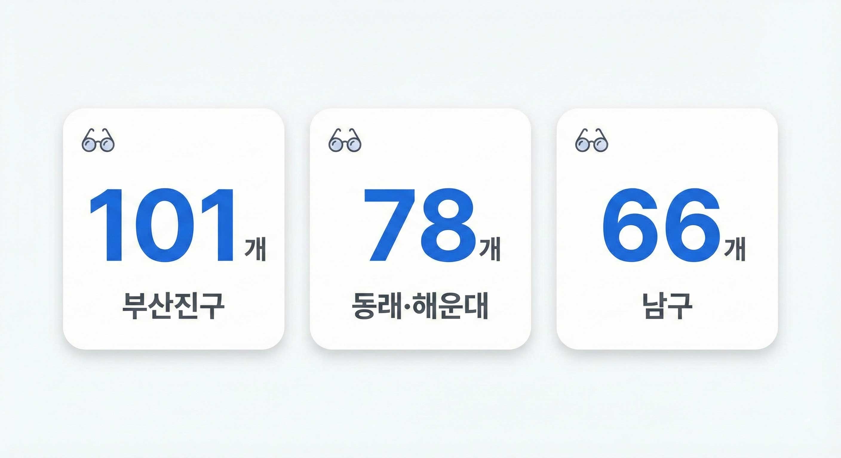 부산 안경원 수치(부산진구 101, 동래·해운대 78, 남구 66 등)는 그 자체로 정답이 아니라, 고객 흐름과 경쟁 강도를 읽는 지도입니다.