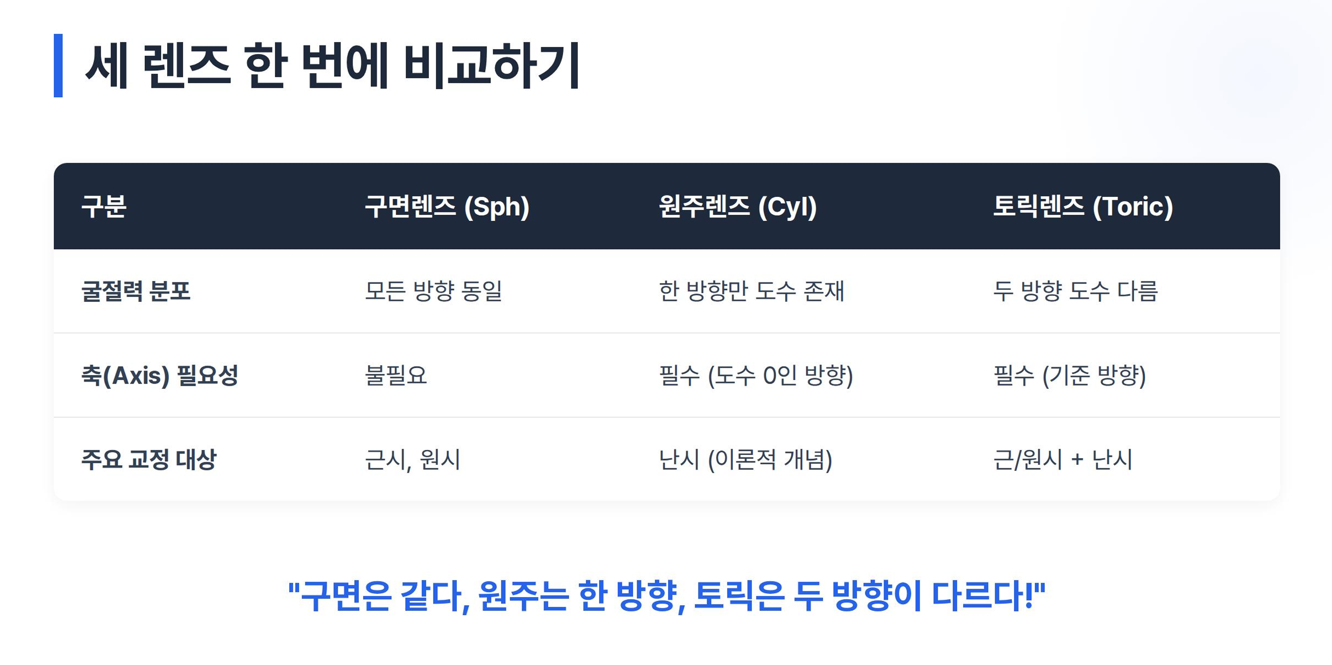 이 세 문장만 제대로 이해하면, 이후 난시 교정 렌즈를 배울 때 훨씬 수월해집니다.